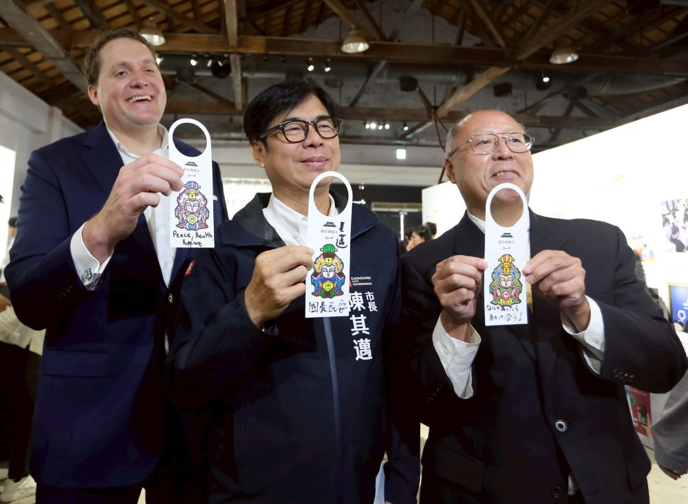市長陳其邁(中)在手作區製作象徵守護的「防災掛牌」。(記者吳峙嵩攝)