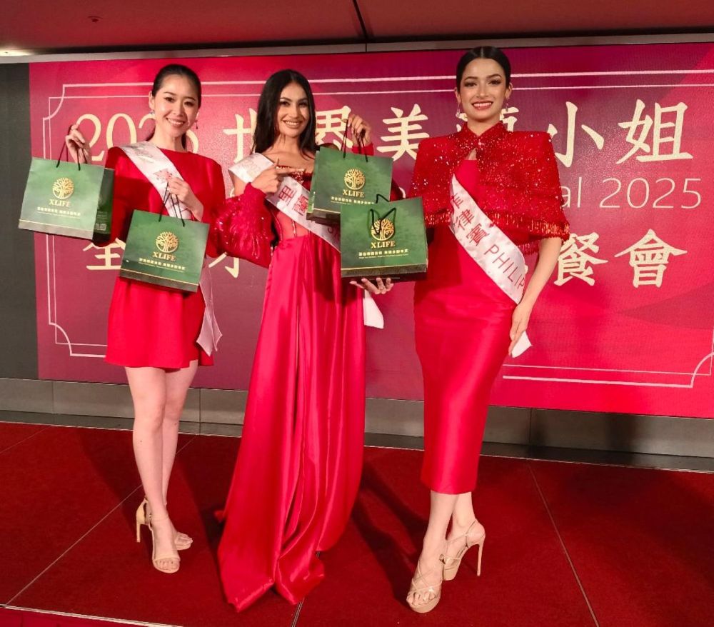 2026世界美顏小姐才藝賽前三名合影,左起第三名台灣小姐陳詩雅、第一名斯里蘭卡小姐與第二名菲律賓小姐。(記者吳峙嵩攝)