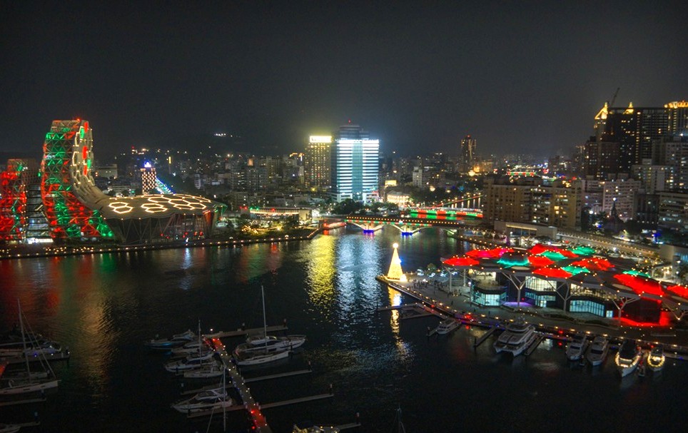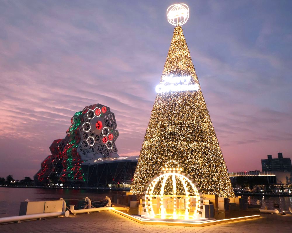 【記者吳峙嵩高雄報導】耶誕節即將到來,位於愛河出海口的高雄流行音樂中心,以其海景第一排絕佳位置,豎起17公尺高的聖誕樹「金勾 TREE」,5日正式亮相,映襯高流音浪塔、海音館、珊瑚礁群的建築外觀燈光變化,閃耀耶誕氣息的主題燈色,受到社群熱烈關注,已超過萬名網友點讚分享,為今冬必訪的打卡景點。
