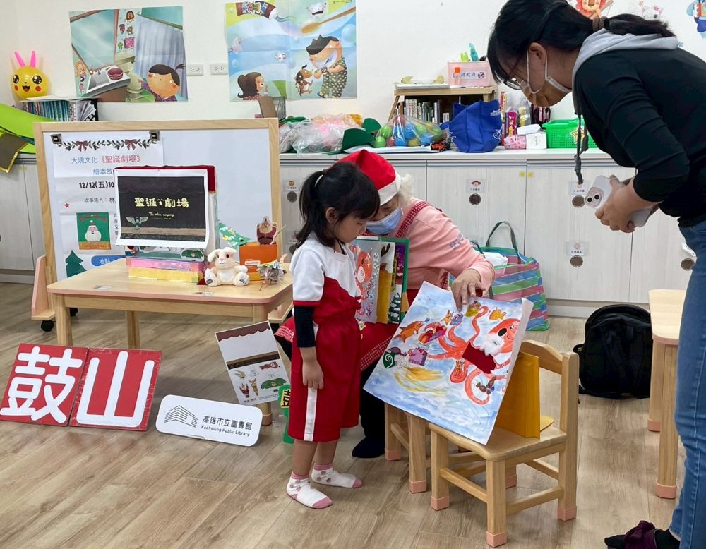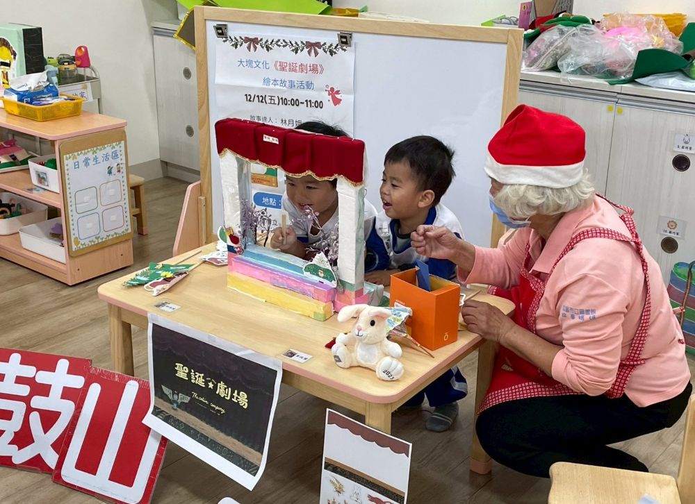 高市圖鼓山分館主任劉秀珍表示,故事達人林月娥以「小小劇場」形式,說演繪本內容,《聖誕劇場》是由日本「小木屋工坊」創作,收錄四齣活潑可愛的耶誕短劇,透過生動的語調,以及肢體表現,引導幼兒進入故事情境,感受角色心情與節慶文化,讓孩童在聆聽中,自然建立閱讀興趣。