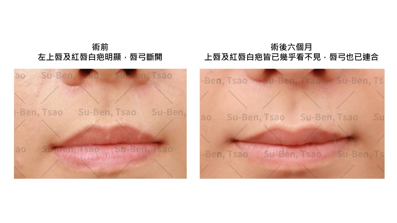 就以「美芳」個案為例,白疤不只在鼻翼及上唇,又涉及唇弓與紅唇部位,需同步施行唇弓斷開縫合,與紅唇白疤切除術,才能一併根治。紅唇白疤如用白疤治療恐無效,無法使顏色回復成紅色,改以白疤切除加上細緻性縫合術,可去疤又能回復成紅色。