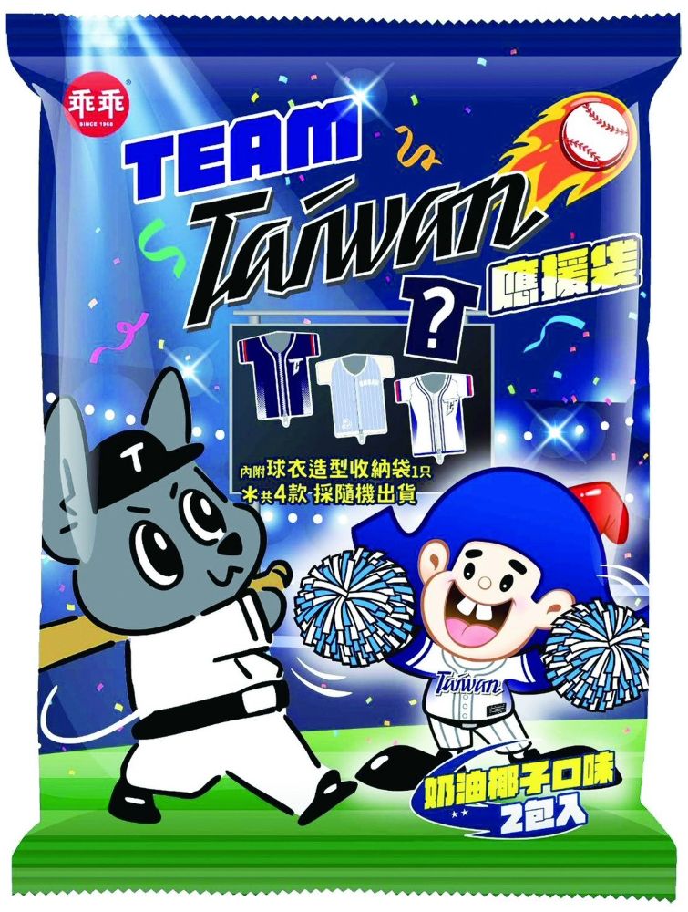 值得一提,乖乖長期力挺台灣棒球運動,正逢世界棒球經典賽開打,亦趁勢推出Team Taiwan應援袋,除乖乖經典款-奶油椰子,可用於賽事集氣外,另有中職聯盟授權品牌推出球衣造型收納袋,隨袋附贈球衣造型收納袋,含隱藏版共4款隨機出貨(全台限量12,000袋)。家樂福也搶先新上架限量「乖乖Team Taiwan應援袋」(40克x2)/原價299元、特價269元。